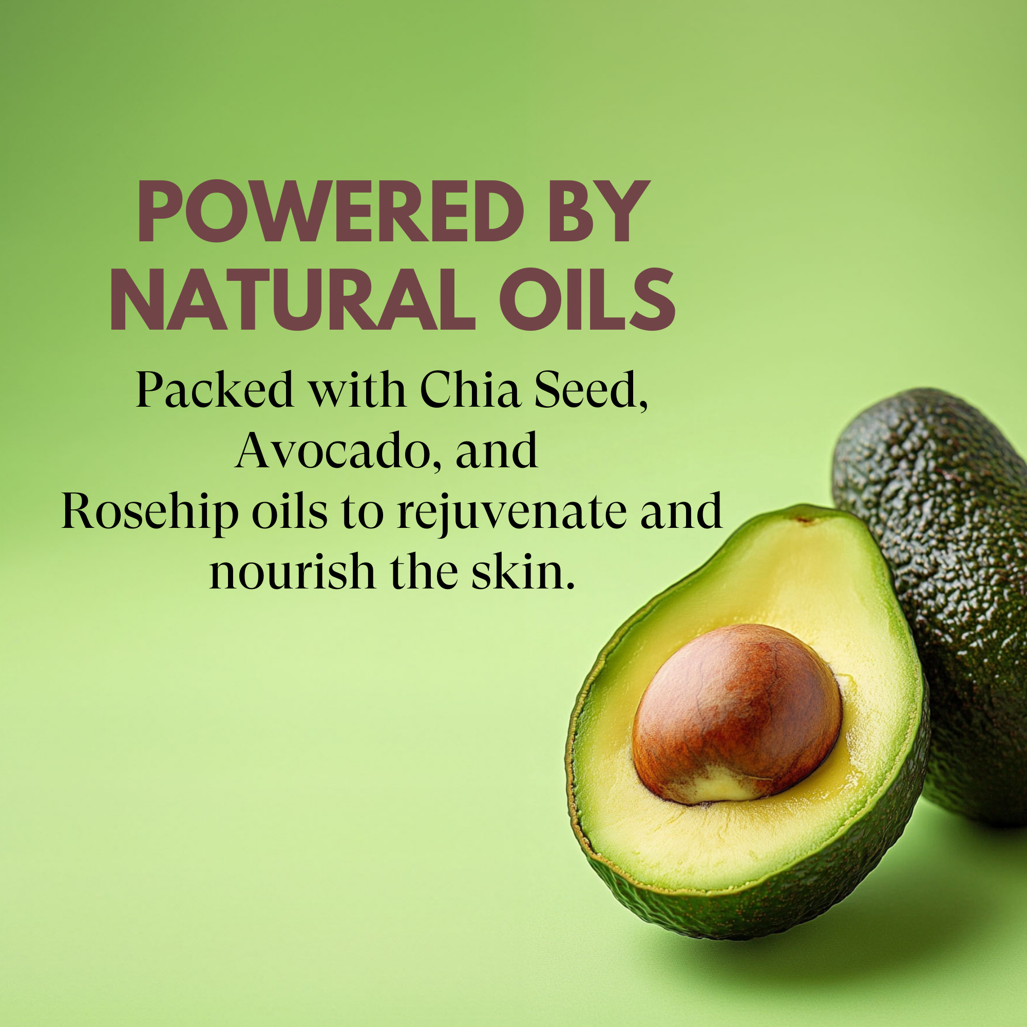 Our Serum addresses this with a targeted blend of premium oils. Rosehip and pomegranate seed oils help improve the appearance of skin tone and texture.